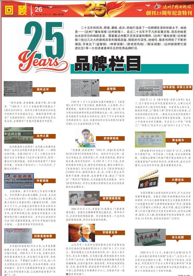 二十五年的風(fēng)雨、輝煌、磨煉、成長,把她打造成了一位婀娜多姿的妙齡女子。她就是——《達州廣播電視報(達州新報)》。走過二十五年不平凡的發(fā)展歷程,現(xiàn)在的她更加光彩奪目和絢麗多姿。厚載著達州數(shù)萬忠實讀者的期待,《達州廣播電視報(達州新報)》經(jīng)過幾次大的新聞改革和報紙改版,報紙的可讀性、地域性、服務(wù)性得到了不斷的增強,孕育出了《詩凡話題》等一大批讀者喜聞樂見的優(yōu)秀品牌欄目。
