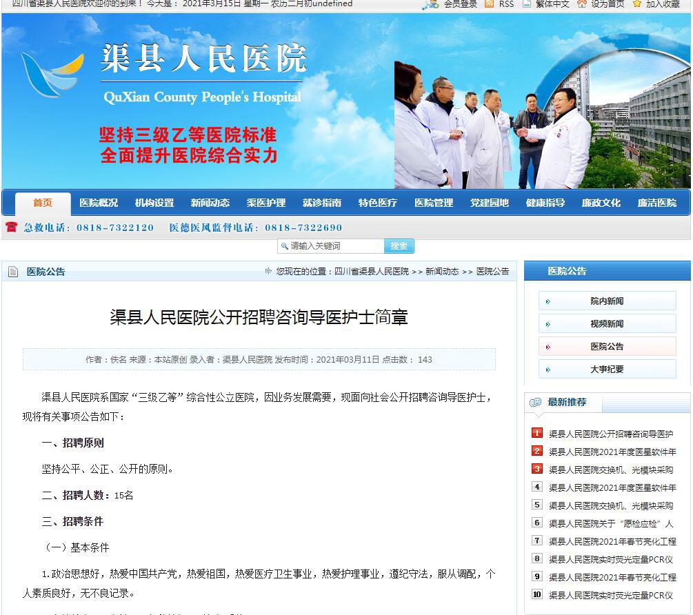 達(dá)聘網(wǎng)(www.0818rc.net)達(dá)州人才網(wǎng)訊,渠縣人民醫(yī)院系國家“三級(jí)乙等”綜合性公立醫(yī)院,因業(yè)務(wù)發(fā)展需要,現(xiàn)面向社會(huì)公開招聘咨詢導(dǎo)醫(yī)護(hù)士,現(xiàn)將有關(guān)事項(xiàng)公告如下: